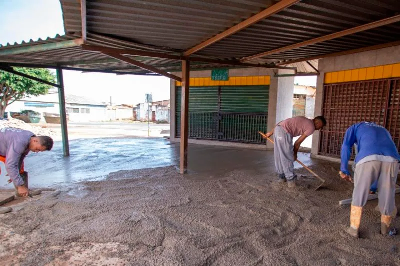 Na manhã desta terça-feira (09), a Prefeitura Municipal, através da Secretaria de Obras, deu continuidade às obras de concretagem do piso na praça de alimentação da Feira do Produtor Rural, localizada no bairro Pedregal.