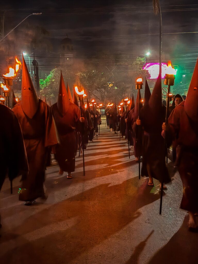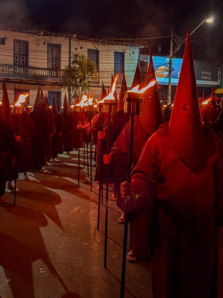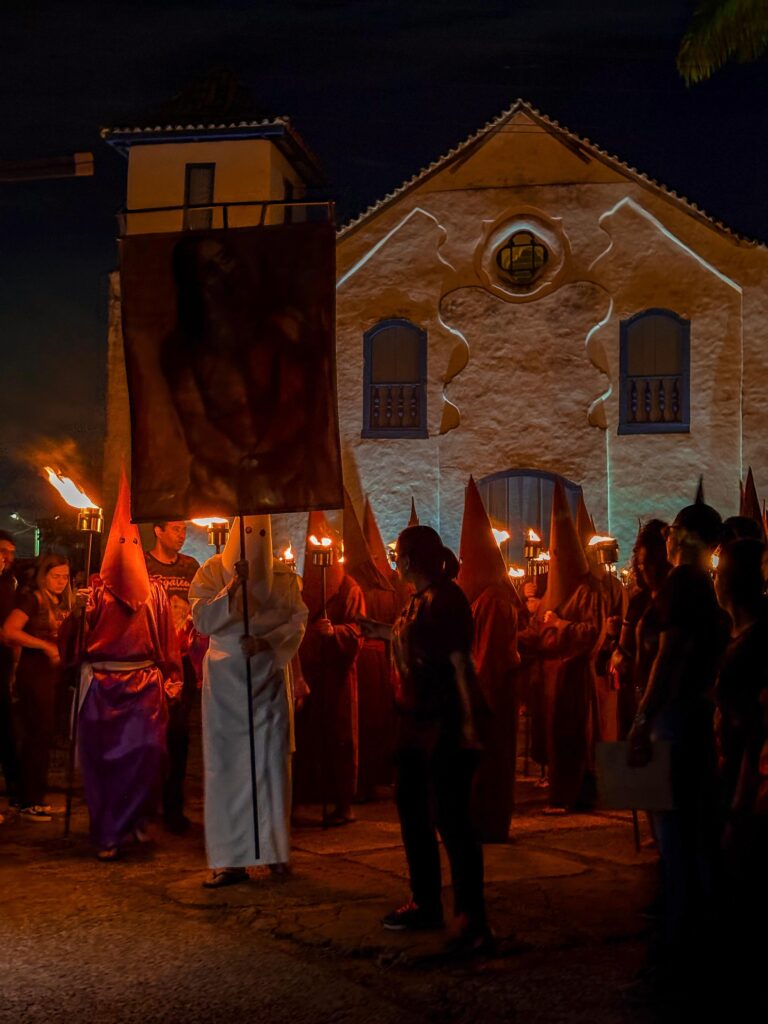 Um dos destaques da noite foi a participação dos 46 farricocos, personagens vestidos com túnicas e capuzes pontiagudos, simbolizando os soldados romanos. Carregando tochas acesas, eles criaram uma atmosfera de mistério e reflexão, característica marcante do ritual religioso.