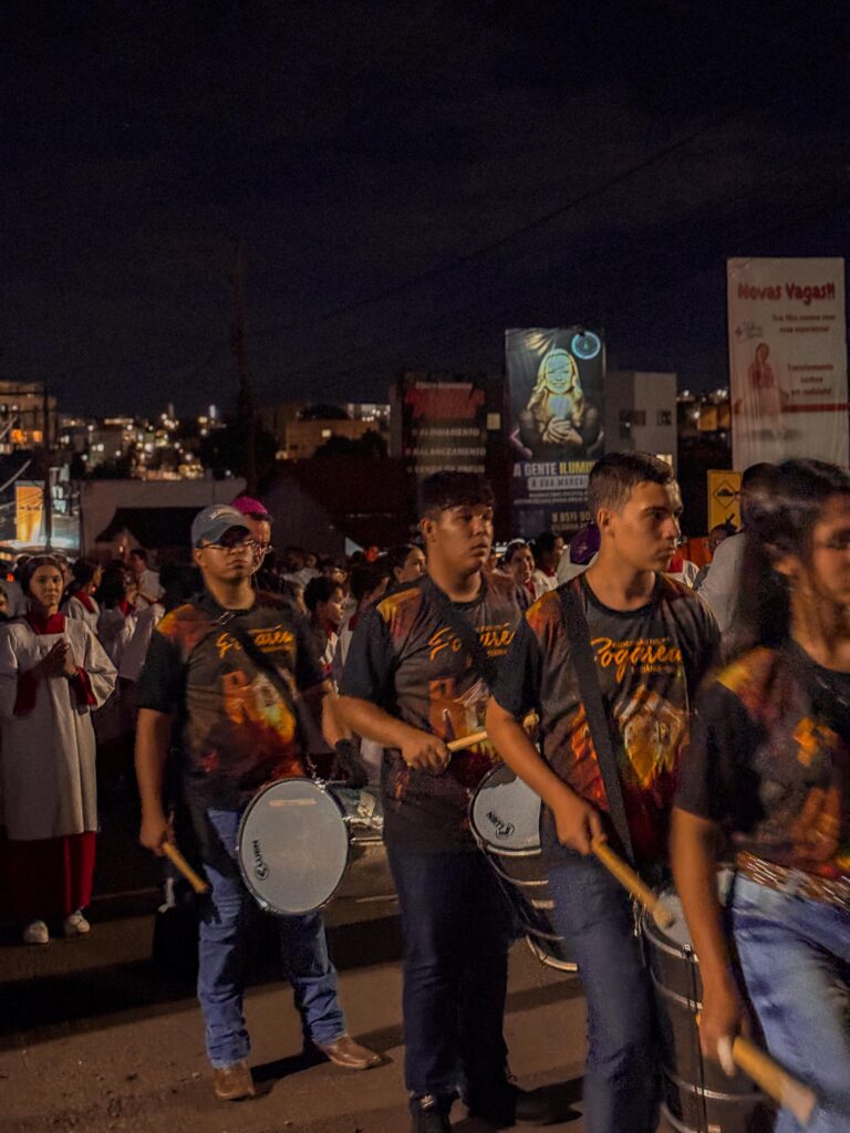 A procissão também contou com o acompanhamento de uma fanfarra composta por 33 integrantes, responsável por anunciar a passagem do cortejo e intensificar o clima solene ao longo do trajeto.